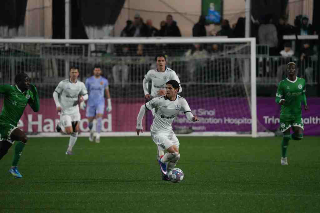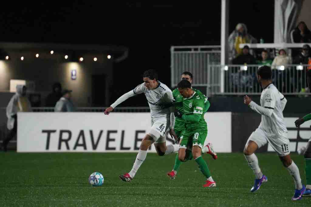 In a first half defined by tight defensive organization from both sides, Hartford Athletic was the first to find the frame, forcing the first save of the game out of Vegas in the 23rd minute. Hartford’s Britton Fischer got on the end of a well-weighted free kick in the 18-yard box, nodding a header just under the bar that Vegas tipped just over the bar with a diving stop. Four minutes later, Arturo Diz Pe fired a long, bouncing shot on target that Vegas once again palmed away, and defender Nick Scardina swooped in to clear the rebound away.