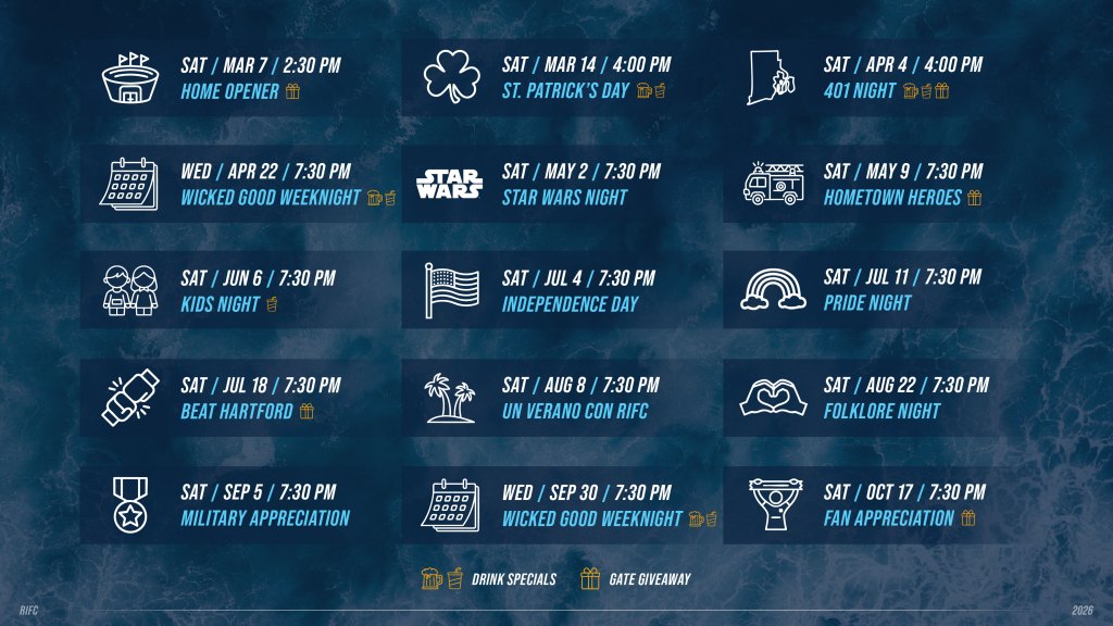PAWTUCKET, R.I. (Jan. 21, 2026) – Today, Rhode Island FC announced its promotional schedule for the 2026 season, highlighted by a slate of unique celebrations at Centreville Bank Stadium and nine specialty ticket and merch packs. The fun will begin with Rhode Island FC’s Home Opener on March 7 at 2:30 p.m., presented by Centreville Bank, when the Ocean State club welcomes Loudoun United FC. Headlined by a pregame flyover, the highly-anticipated opener will feature a special commemorative RIFC beer, courtesy of The Guild Brewing Company, and a blanket giveaway, courtesy of Centreville Bank. Single-game tickets for the entire 2026 season at Centreville Bank Stadium are available here.