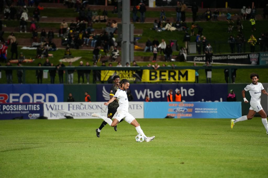 The early momentum paid off in the 21st minute when New Mexico exploded into a counter-attack. Moving quickly from end to end, the attacking surge saw Mukwelle Akale get on the end of a dangerous low cross from Valentin Noël at the top of the box. Akale ran swiftly into open space, and quickly deposited a composed shot past Vegas with a one-touch finish to give the homeside the first-half lead.